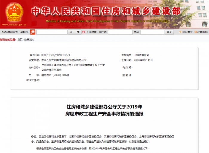 日前,住建部辦公廳下發(fā)《關(guān)于2019年房屋市政工程生產(chǎn)安全事故情況的通報》,要求,2020年,各地要深入查找本地區(qū)安全生產(chǎn)工作的薄弱環(huán)節(jié)和突出問題,推動防范化解施工安全重大風險各項部署落地見效,堅決遏制重特大事故。