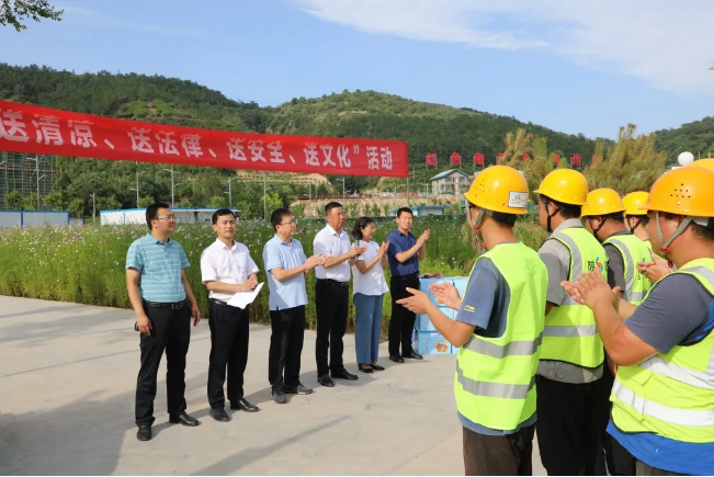 8月10日,延安市政協(xié)副主席、市總工會黨組書記、主席黑樹林一行來到陜建十三建公司南泥灣紅色文化小鎮(zhèn)項目慰問項目一線建設者,為他們送去茶葉、蜂蜜、綠豆、小米等防暑降溫物品。市總工會副主席、女職委主任鄭艷霞,南泥灣開發(fā)區(qū)黨工委副書記折克銀,市總工會辦公室副主任、困難職工幫扶中心主任惠瑞國,市總工會辦公室副主任、宣教部負責人康靖華,陜建十三建公司紀委書記、工會主席張軍祥出席活動。