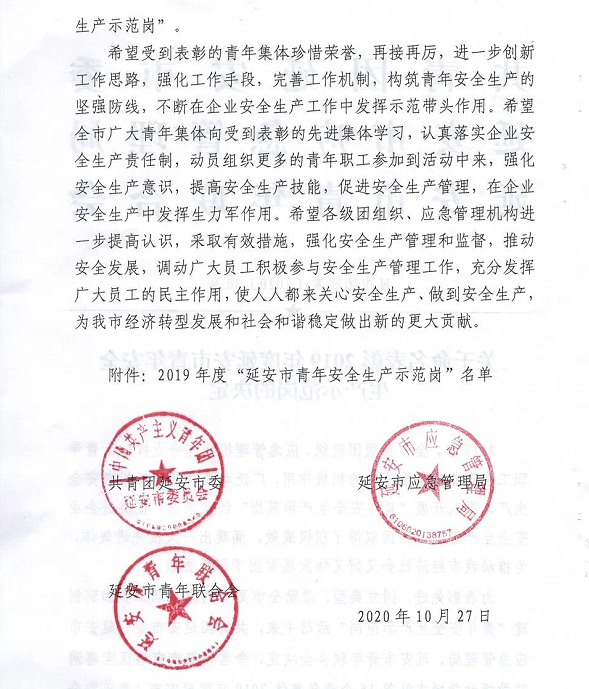 | 公司多個(gè)集體榮獲“延安市青年安全生產(chǎn)示范崗”稱號(hào) |