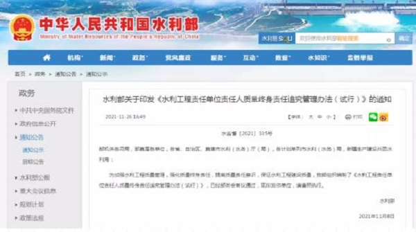 水利部關(guān)于印發(fā)《水利工程責(zé)任單位責(zé)任人質(zhì)量終身責(zé)任追究管理辦法(試行)》的通知
