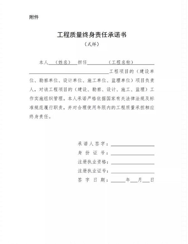 第十二條 項目負責(zé)人應(yīng)當(dāng)在辦理工程質(zhì)量監(jiān)督手續(xù)前簽署工程質(zhì)量終身責(zé)任承諾書(式樣參見附件),連同項目負責(zé)人證明材料,由建設(shè)單位(項目法人)報工程質(zhì)量監(jiān)督機構(gòu)備案。項目負責(zé)人如有更換的,應(yīng)按前述規(guī)定重新備案。