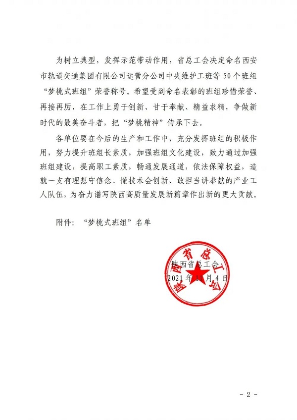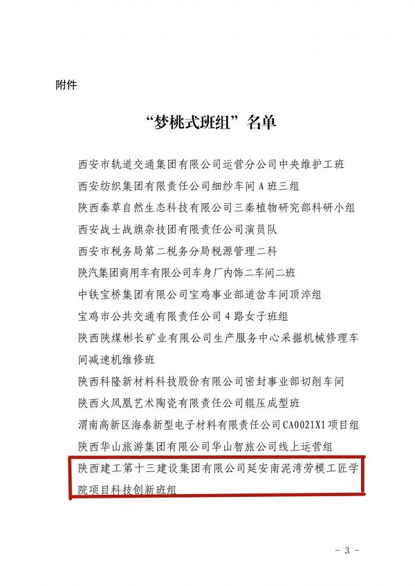 為進(jìn)一步傳承和弘揚(yáng)“高標(biāo)準(zhǔn)、嚴(yán)要求、行動快、工作實(shí)、搶困難、送方便”和“不讓一個伙伴掉隊(duì)”的“夢桃精神”,近日,陜西省總工會對全省50個優(yōu)秀班組進(jìn)行了榮譽(yù)表彰,授予他們“夢桃式班組”榮譽(yù)稱號,集團(tuán)延安南泥灣勞模工匠學(xué)院項(xiàng)目科技創(chuàng)新班組獲此殊榮。