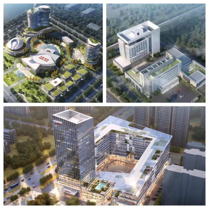 項(xiàng)目鳥(niǎo)瞰圖:上左-國(guó)際健美健身聯(lián)合會(huì)IFBB-CBBA文化發(fā)展交流中心項(xiàng)目;上右-空港領(lǐng)航大廈項(xiàng)目二期;下-渭城商務(wù)功能區(qū)項(xiàng)目