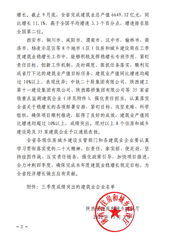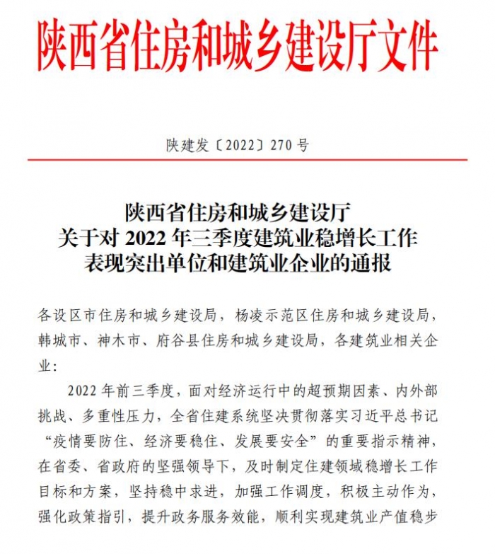 11月2日,陜西省住房和城鄉(xiāng)建設(shè)廳發(fā)布《關(guān)于對2022年三季度建筑業(yè)穩(wěn)增長工作表現(xiàn)突出單位和建筑業(yè)企業(yè)的通報(bào)》,集團(tuán)被省住建廳評為“三季度成績突出建筑業(yè)企業(yè)”。