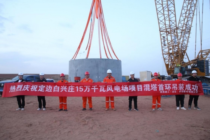 近日,集團新型建材公司為中材海外榆林定邊白興莊150MW風電場項目生產(chǎn)的混凝土塔筒管片首環(huán)吊裝順利完成。